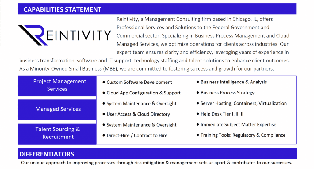 Our capabilities statement outlines a focused approach to solve complex business challenges, emphasizing efficiency, innovation, and scalable solutions tailored to meet specific customer needs.
